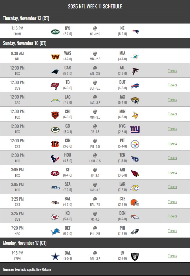 NFL 2025 Regular Season Week 11 at glance: