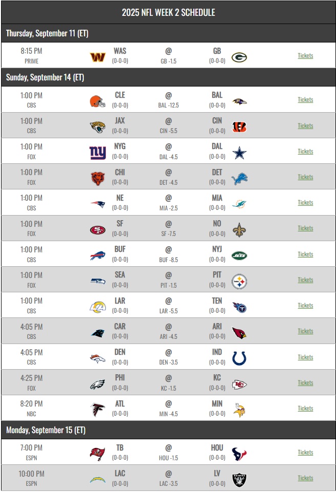 Week 2 of the NFL’s 2025 regular season continues the early-season excitement with several key matchups and intriguing storylines. The NFL regular season Week 2 for 2025 features 16 games from September 11–15, including prime-time matchups and key divisional games. Here’s a details overview: