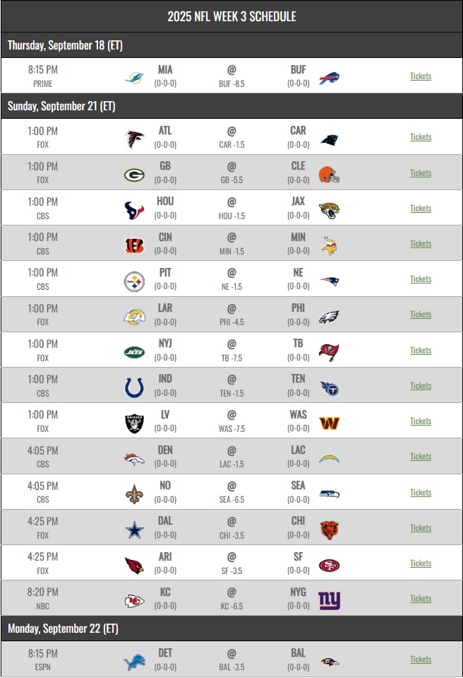 Week 3 of the **2025 NFL season (Sept 18–22)** is packed with divisional battles and primetime headliners. The action kicks off with **Dolphins vs Bills** in a heated AFC East rivalry. Sunday brings a full slate of early matchups, including **Texans–Jaguars** and **Steelers–Patriots**, followed by marquee late games like **Cowboys–Bears** and **49ers–Cardinals**. In primetime, the **Chiefs face the Giants** on Sunday night, and the week wraps Monday with the **Lions visiting the Ravens**.